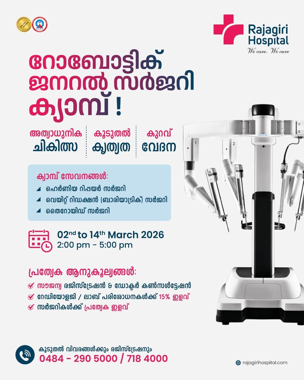 Rajagiri Hospital is proud to announce a specialized surgery camp focusing on the future of healthcare. Experience the precision of robotic-assisted surgery with our expert medical team.